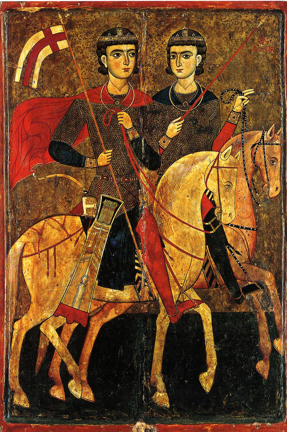 I Santi Sergio e Bacco sono stati due giovani militari dell'esercito romano al servizio dell'imperatore Massimiliano, avevano una alta posizione presso la corte di Massimino Daia divenuto cesare nel 305. Inviati entrambi in Oriente Sergio e Bacco contribuirono alla vittoria romana. Ma presto sono stati denunciati perché non partescipavano alle feste pagane, degradati come militari e convocati al cospetto dell’imperatore Massimiliano. Sergio e Bacco rifiutarono di adorare idoli, riaffermando la loro fede cristiana. Per punirli e constringerli a venerare dei pagani Massimiliano ordinò di togliergli i segni della loro dignità militare e rivestirli nei abiti femminili e così schernendoli e portandoli in giro per la città con cerchi di ferro al collo. Dopo di che sono stati sottoposti alla crudele flagellazione. Sotto i colpi della frusta morì san Bacco e il suo corpo fu lasciato insepolto. Durante la notte i cristiani lo seppellirono in una delle loro grotte vicine. Invece San Sergio fu trasferito a Resafa di Siria, dove dopo le torture è stato decapitato. Fu sepolto nel luogo del suo martirio e sul quale fu eretta una piccola chiesa.
