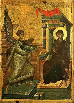 Ангел: Хочеш від мене довідатися, Діво, про Твоє зачаття, але воно є невимовним; Дух же Святий творчою силою осінить Тебе і звершить.
