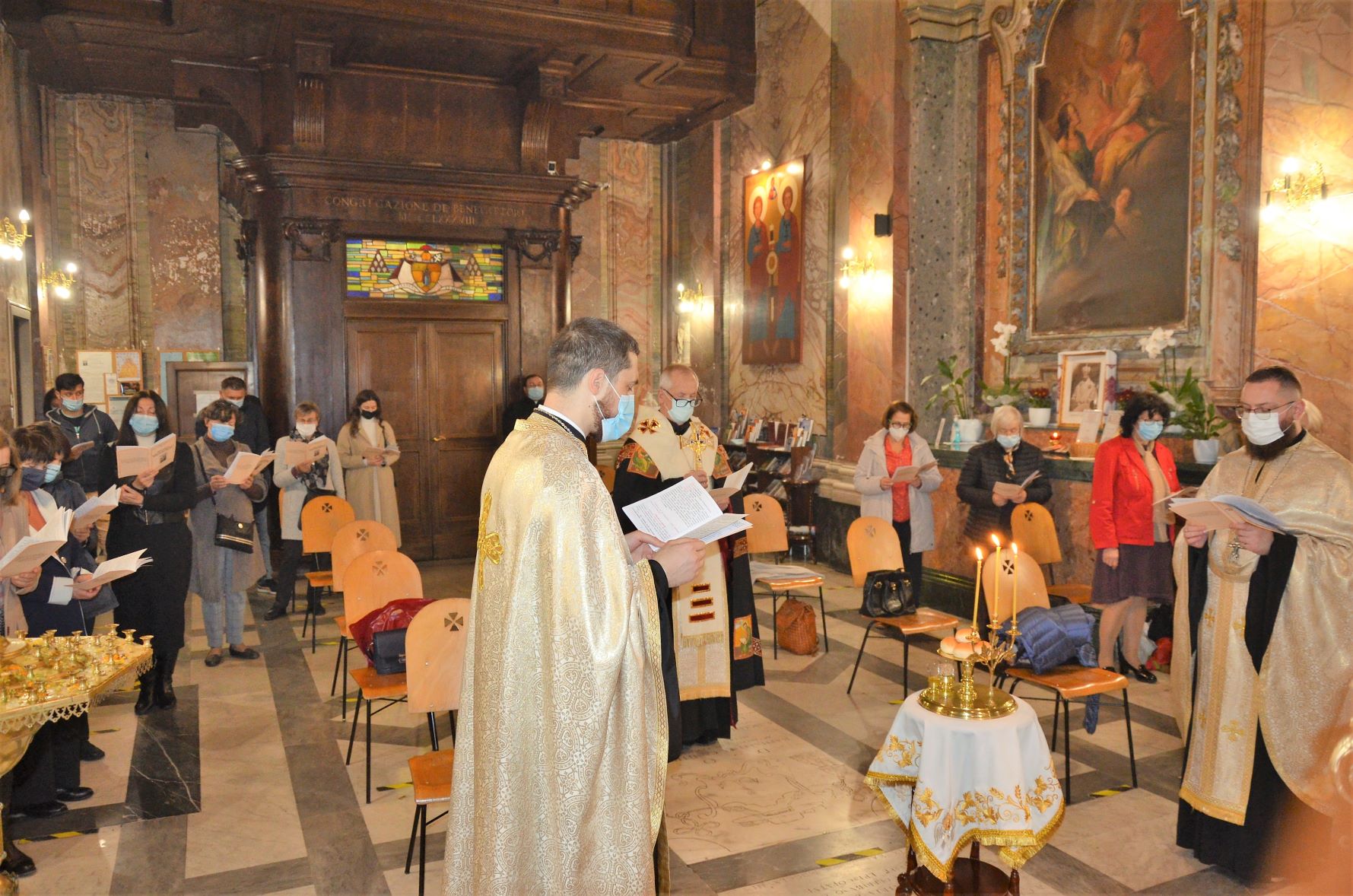 7 листопада 2021 року, в навечір’я празника Собору архистратига Михаїла та інших безплотних сил в катедральному храмі святих мучеників Сергія і Вакха та Жировицької ікони Пресвятої Богородиці в Римі була звершена Велика Вечірня з Литією, яку очолив преосвященний владика Діонісій Ляхович, Апостольський Екзарх для українців католиків візантійського обряду в Італії. Архиєрею співслужили єрей Тарас Остафіїв, парох Української парафії святих мучеників Сергія і Вакха та Жировицької ікони Пресвятої Богородиці в Римі та єрей Руслан Сідельник, віцепарох цієї ж парафії. Молитву співом супроводжували студенти папської колегії «Руссікум», що навчаються в Римі у різних папських університетах, які завітали до парафіяльної спільноти разом з духівником колегії, єромонахом Йосифом Зайцем, Т.І.