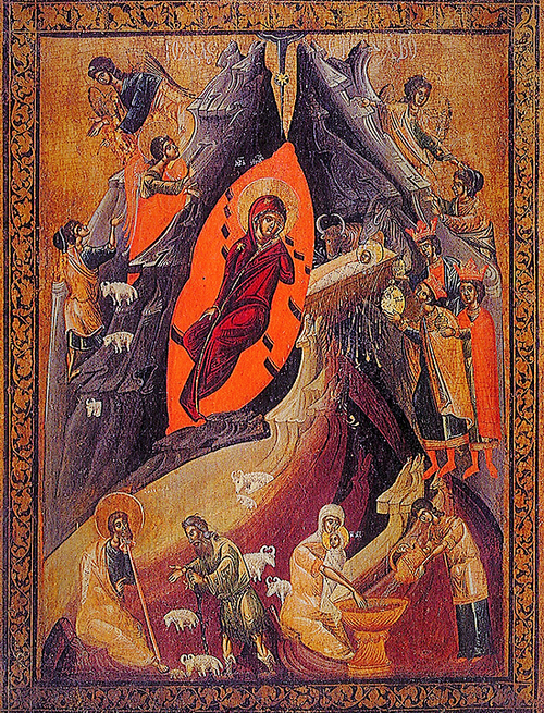 Богородиця дивиться в бік ясел, які нагадують саркофаг. Це глибока і важлива символіка: народжується Той, хто задля нас прийме смерть. Ісус лежить сповитий, але Його пеленки ототожнюють погребальні пелени, які потім стануть плащаницею. Ясла поміщені в печеру, у чорну глибину землі: Ісус приходить на землю, щоб увійти ще глибше – до Аду. Цікаво, що сіно в яслах, де лежить Христос, спадає золотим дощем – це може символізувати «вогонь Божества», який зійшов на землю.
