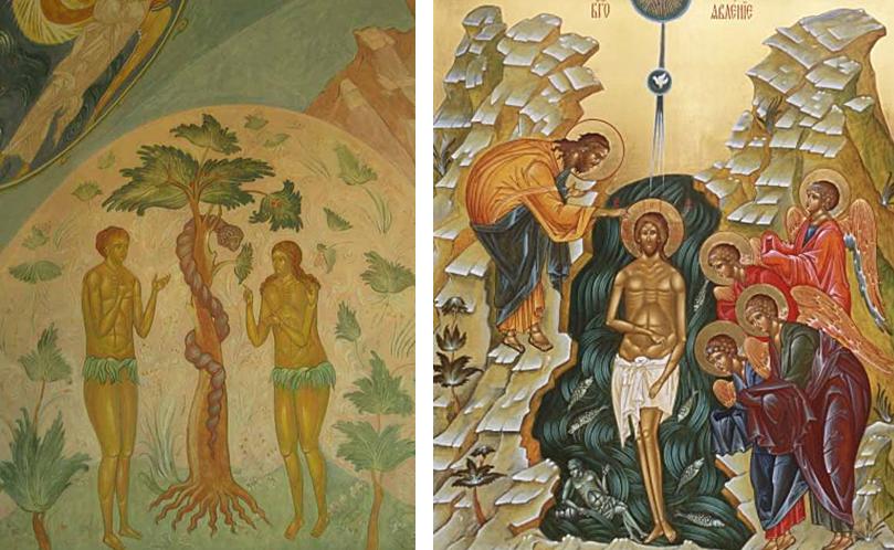 Тропар передсвяття закликає веселитися Адама і Єву, адже Христос гряде до хрещення, щоб взяти на себе їхні гріхи і гріхи потомків їхніх та змити у течіях Йордану-ріки (пор. Мт 1,21; Йо 1,36) [4]. Їм більше не слід скриватися (ховатися) від Бога, як колись у раю після гріхопадіння (пор. Бут 3,6-7) [5]. Бог, відаючи про їхню вину, бере її на себе та повертає їм первісну одежу – благодать єдності з Богом. Мова зовсім не йде про одежу у буквальному значенні, адже Адам і Єва сотворені були нагими і не соромилися один одного. Сором і відповідно зшивання смоківного листя, щоб прикрити тіло, слідує уже після гріхопадіння. Тому під первісною одежею слід розуміти первісну благодать, з якої себе обнажили Адам і Єва, впавши у гріх.